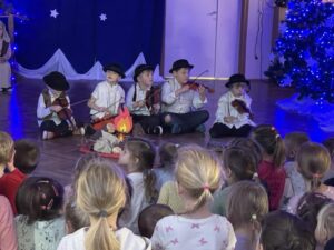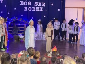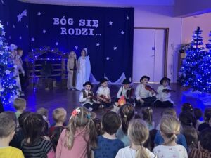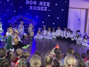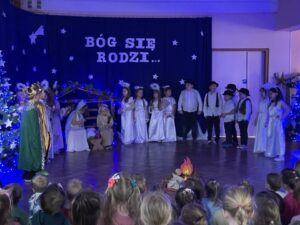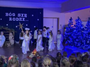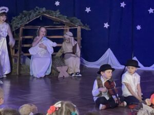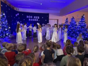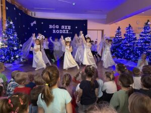 W czwartek 19 grudnia w przedszkolu odbyły się Jasełka Bożonarodzeniowe przygotowane przez przedszkolaków z grupy 12. Dzieci w przejmujący sposób opowiedziały historię Bożego Narodzenia. Celem wystąpienia było wprowadzenie wszystkich w świąteczną atmosferę, pełną radości i spokoju. Nie zabrakło również pięknych kolęd, pastorałek i tańca aniołków. Na koniec Pani dyrektor złożyła wszystkim spokojnych, radosnych świąt Bożego Narodzenia spędzonych w gronie rodziny.